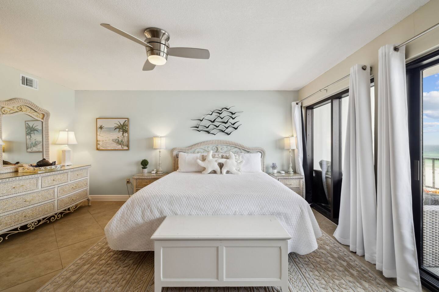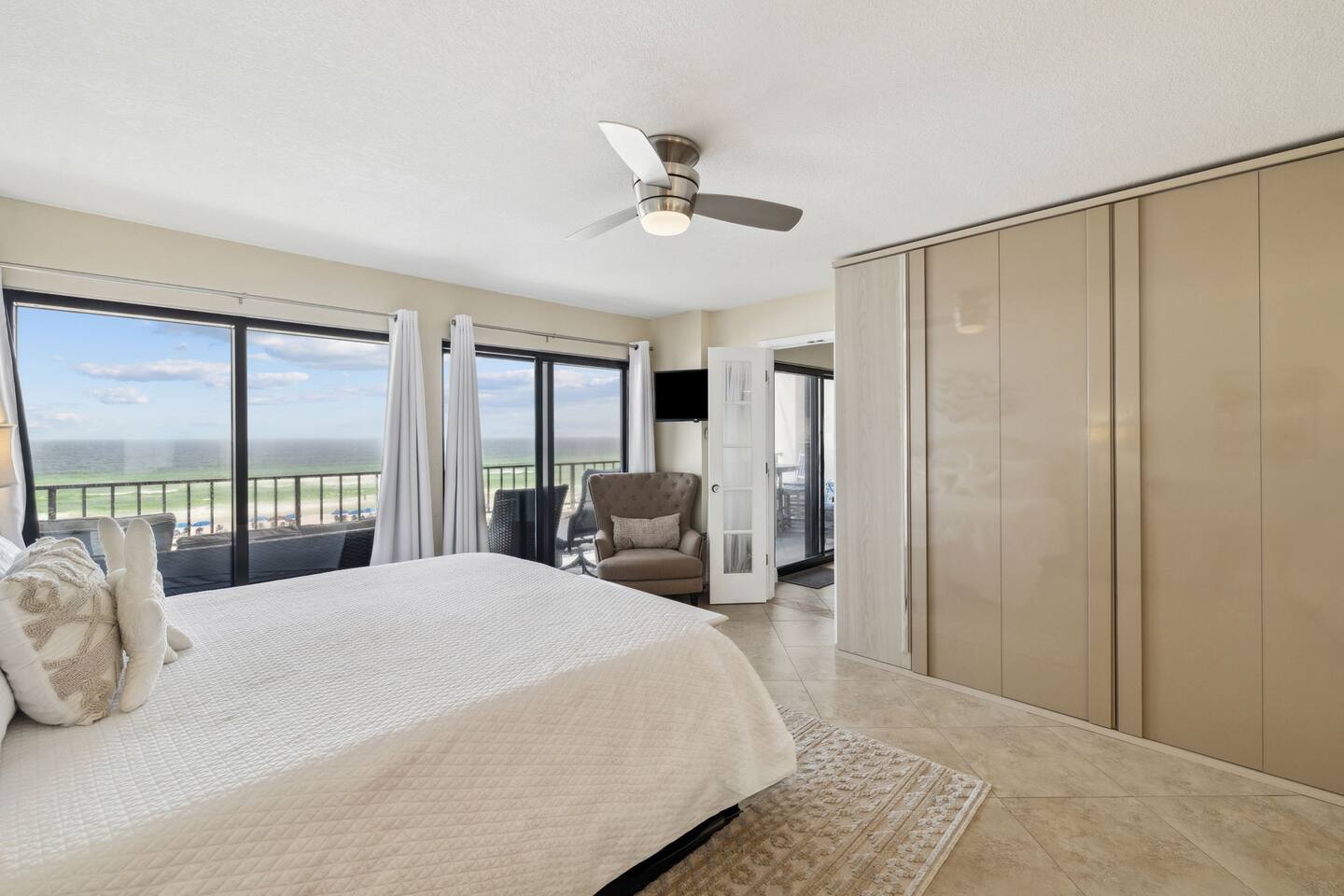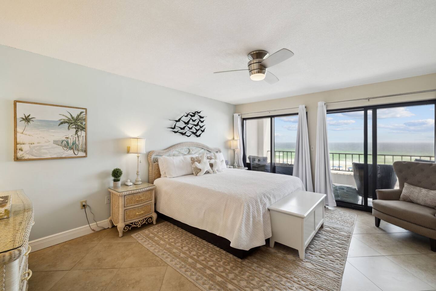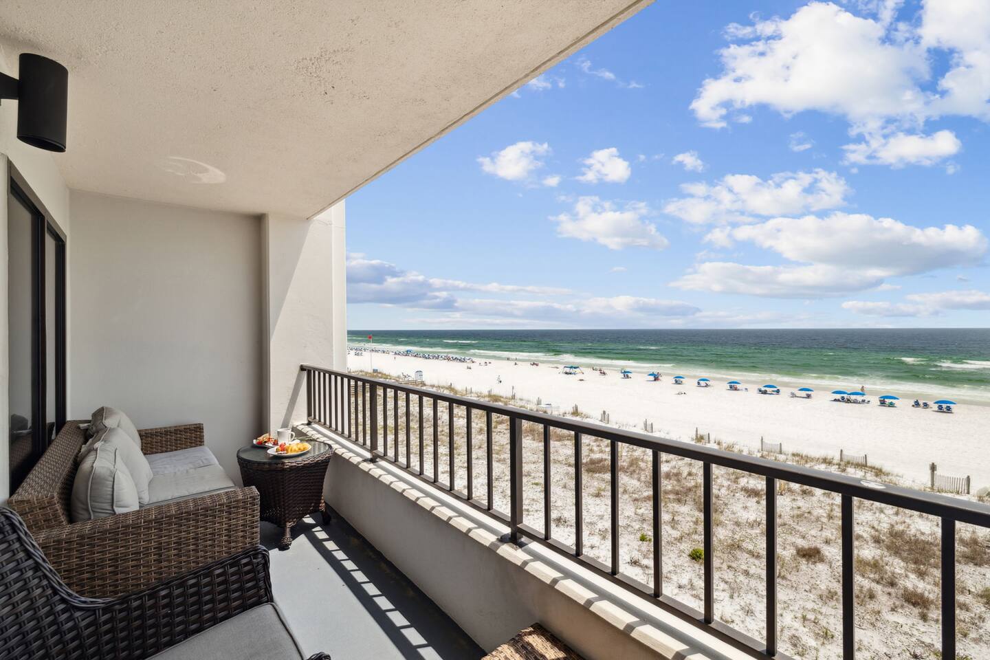 It doesn't get better than this. Enter your private beach oasis with elegant touches throughout. The moment you open your door, you know why you booked with us, you're ready to enjoy a fabulous vacation. Tastefully decorated, a modern beach theme, high-end appliances and furniture, all with the comforts of home, but so much better! Why cram into a hotel room when you can have a spacious, 2-bedroom condo overlooking the emerald green waters of the Gulf of Mexico? Free beach service included on this uncrowded beach! Welcome to your spacious condo with remarkably elegant renovations. Our Surf Dweller location offers you the most ample space in the area with 1453 sq ft! Our 4th floor beach condo is just what you need for a respite from the hustle and bustle of life. Kitchen: The spacious kitchen and dining areas are designed to flow directly into the living area and create an open space not seen in many condos, with amazing Gulf front views. The kitchen has high end cabinetry with soft-close doors/drawers, granite countertops and beautiful stainless steel appliances. A large granite kitchen island gives you plenty of room to entertain and perfect for those family gatherings. Start your morning off right with a single cup, or full pot, of java from the coffee bar and enjoy the beautiful morning view off your lanai. End the day by choosing your favorite bottle of wine from the wine cooler, relaxing as the cool breeze off the ocean helps you reflect on the fabulous day you just experienced with your friends or loved ones. Love to cook? Entertain with a gourmet meal on the 6-burner stove top, visiting with your family around the generous granite island. The kitchen is fully equipped with high quality pots & pans, toaster, Keurig coffee maker, bakeware, glasses, coffee cups, utensils, serving platters and bowls, children's dishes, and many more items, so prep time will be a breeze. Prefer not to cook? You have so many restaurants to choose from, you may have a hard time narrowing it down! Living Space: Enjoy incredible views while lounging in the comfortable electric reclining couch and chairs. Or catch up on your favorite how that you've had to put off watching while running the rat race in that other place you sometimes call home. You can enjoy DirectTV on your 65" screen TV or connect to your subscriptions and try out a new movie with your friends and loved ones. Or enjoy a board game, read a book, or play a card game, all available in your unit. Master Bedroom: French doors separate the primary suite from the living area. Your sleep will be the best you've had in a long time on your comfortable king bed using nature's noise machine with the ocean waves lulling you to sleep. The high-end wardrobe features a lockable drawer and plenty of space for all your belongings. In the spacious walk-in closet we have all the extras you might need like a pack - n - play, high chair, and linens, to name a few. Guest Bedroom: The guest bedroom has a retractable room divider with two separate entrances, a remote control light, fan, and a queen bed on each side, for optimal sleeping arrangements. Don't live out of your suitcase! Store them in the extra large closet available and truly make this your home while you are here. Office: Just off the master bedroom is your office space. None of us really want to work but reality is, we sometimes need to squeeze in a little bit so we can go have fun! So, if working on the lanai overlooking the ocean waves is too distracting, enjoy a little peace and quiet and get things done efficiently in your own office. Our wifi is great for working! With over 50 Mbps download speeds and upload speeds, you won't be waiting for the dreaded spinning wheel from slow internet connections, which means more time for fun! Laundry: Don't over pack because you have a full-size washer and dryer in your unit. Just be sure to leave all the sand on the beach, before washing to keep it functioning well. Bathrooms: After a hard day of playing, enjoy a nice hot shower, with great water pressure, in your newly updated bathrooms. Or, after you've given the kids a bath and gotten them to sleep, soak away your worries and aches in a warm bubble bath. Get outdoors: Your private outdoor space boasts a 30 foot private balcony architecturally designed to make for the best of Gulf front living!! With several different seating options, you can enjoy this space from the minute you wake up until you rest your sleepy head. Or venture off your balcony to the seasonally heated pool that has a 3' shallow end increasing to 8' at the deepest. Too much for the little ones? Don't worry, right next to the "big kids" pool is a fenced kiddy pool area so you can relax while they frolic in a space made just for them and you don't have to chase them the entire time. Tennis or pickleball anyone? Enjoy a little friendly competition in a game of either on the court here at Surf Dweller. It's beach time! That is one of the biggest reasons you are here, right? Just a few steps from your condo, are the beautiful shores of the Gulf of Mexico with emerald green waters and almost powdered sugar sand, a private beach area for Surf Dweller guests. Relax and soak in the sun or play hard until you fall asleep. But don't forget your sunscreen! And don't worry, you don't have waste precious car space, we provide all the supplies for outdoor fun including beach toys & towels, beach chairs, and more! Getting there: We have 3 airports nearby so take your pick. VPS is only about 20-25min away. It is so easy to get to your 4th floor unit, NO steps required! Your free parking spot on the property isn't far from the entrance where carts are available to throw all your belongings onto, then grab the elevator and head up, with the unit being only the 3rd unit from the elevator, you'll be entering paradise before you know it! What to bring: Tired of seeing the words "we provide a starter supply...."? We are too, so we provide much more. We provid